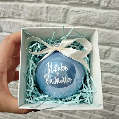 Ёлочный шар с индивидуальной надписью белые и синие (стекло 8см) / Арт.55